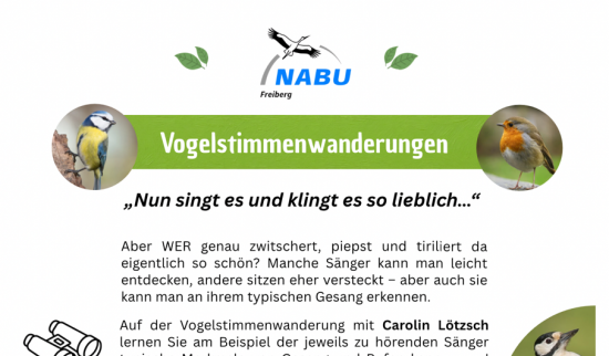 Der NABU Freiberg, im Jahr 2000 gegründet und mit heute 996 Mitgliedern (09/24), ist im Umkreis von 15 bis 20 Kilometer um Freiberg aktiv im praktischen Naturschutz (Offenland- und Gewässerpflege, Amphibienschutz, naturnaher Garten(-teich)). Inzwischen in drei bzw. inkl. Studenten vier Gruppen findet Umweltbildung in der NAJU (Naturschutzjugend) statt. Allen Aktivitäten gemein ist das Hauptziel die Artenvielfalt und das Wissen darum zu fördern - und zwar nicht fokussiert auf besondere Schutzgebiete, sondern in der Normallandschaft, dort wo jeder etwas tun kann. Die Geschäftsstelle wird als Naturschutzstation vom Land Sachsen gefördert. ... mehr