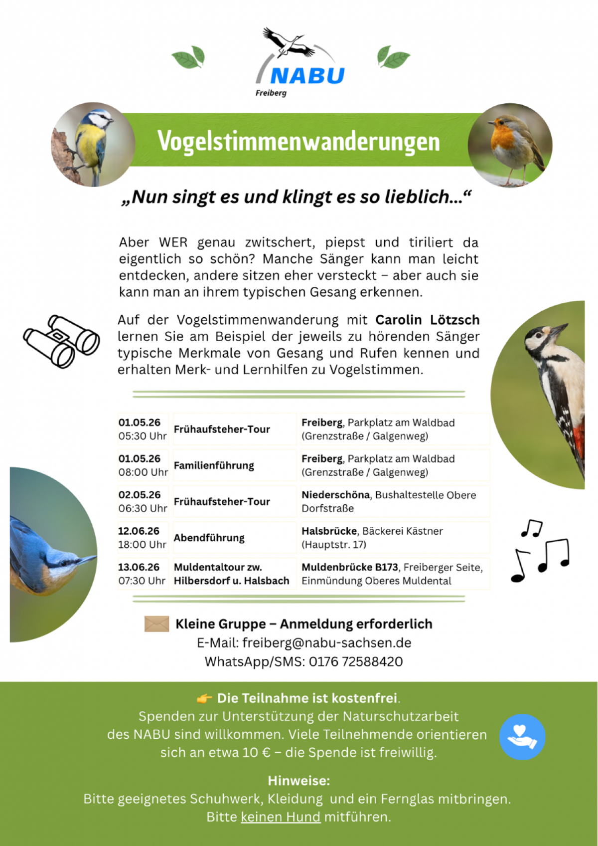In diesem Jahr führt der NABU Freiberg unter der Leitung von Frau Carolin Lötzsch 5 Vogelstimmenwanderungen im Frühling und Frühsommer durch. Diese führen durch den Freiberger Stadtwald, nach Niederschöna und Halsbrücke sowie ins Muldental.